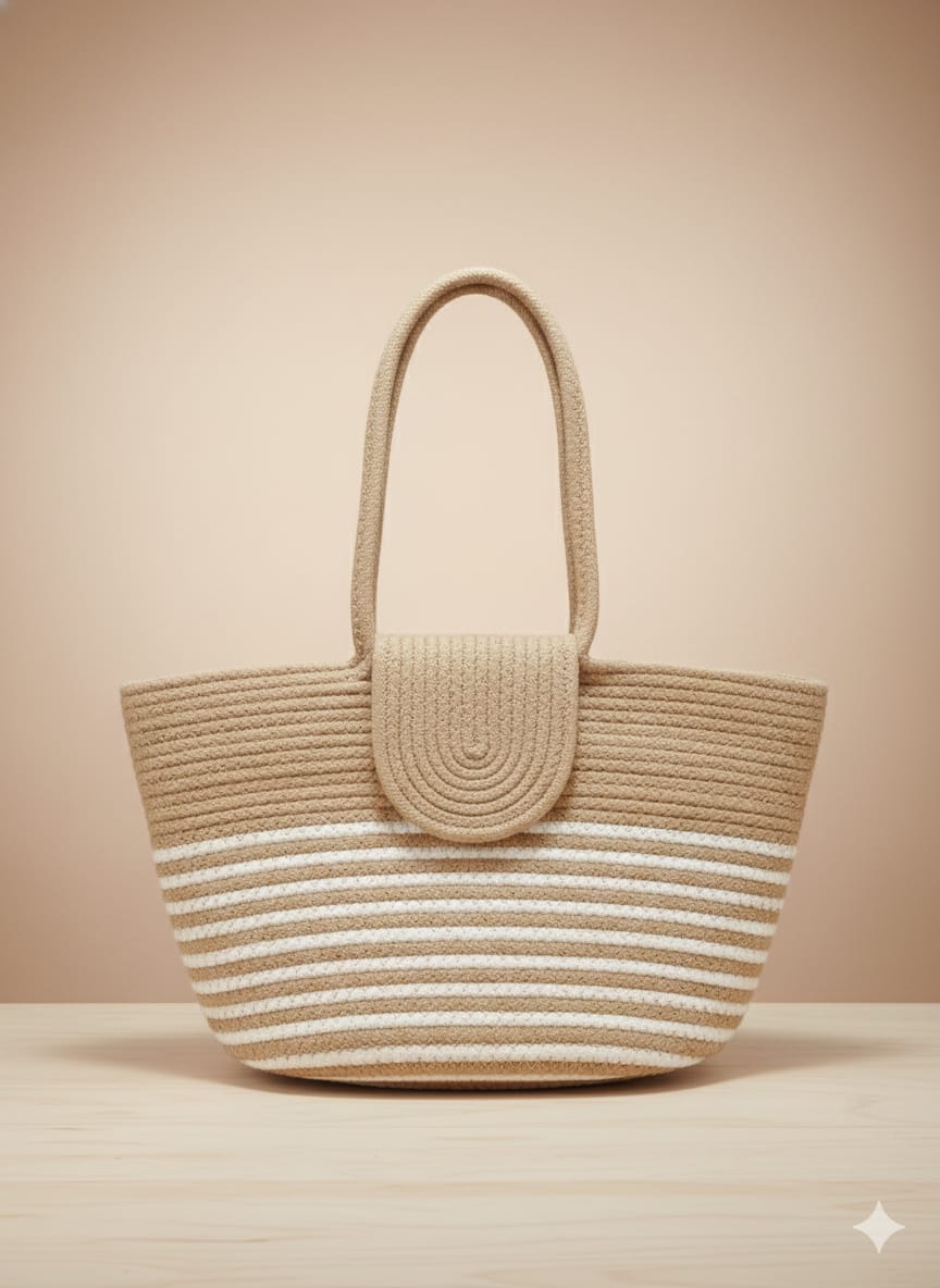 Inspired by earthy tones, the Desert Beige Striped Handmade Jute Tote Bag showcases a beautiful blend of warm beige and natural white stripes. Carefully handcrafted, this tote offers both durability and elegance with a secure flap-style detail.