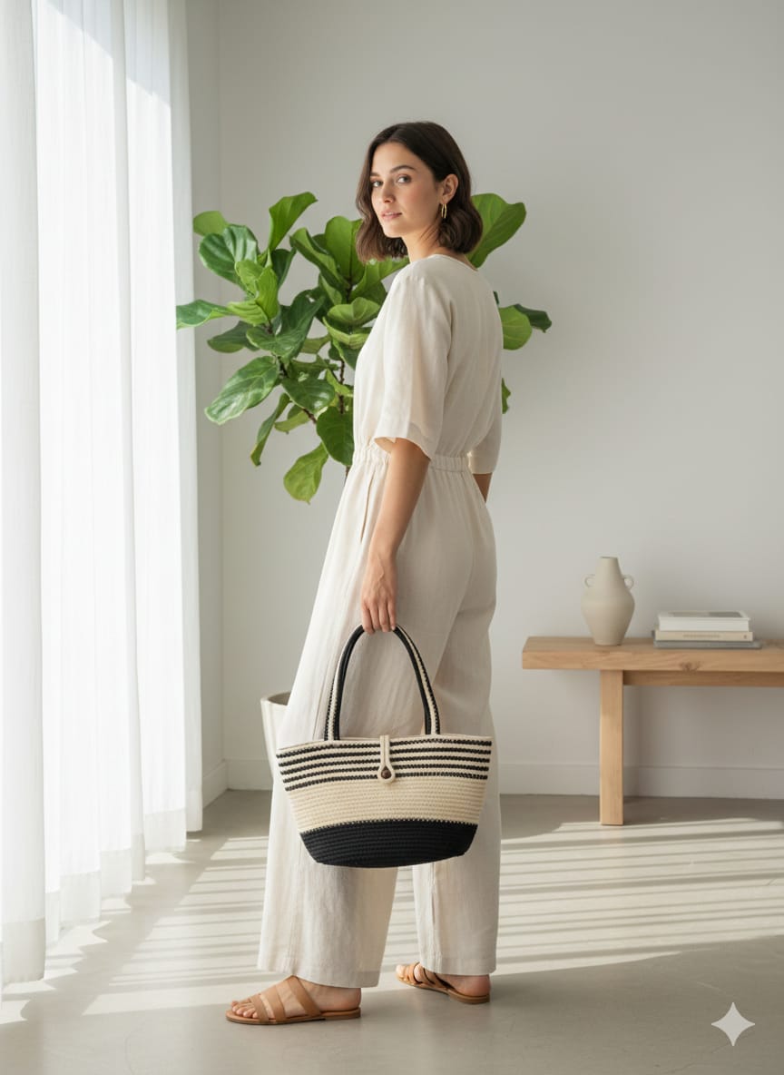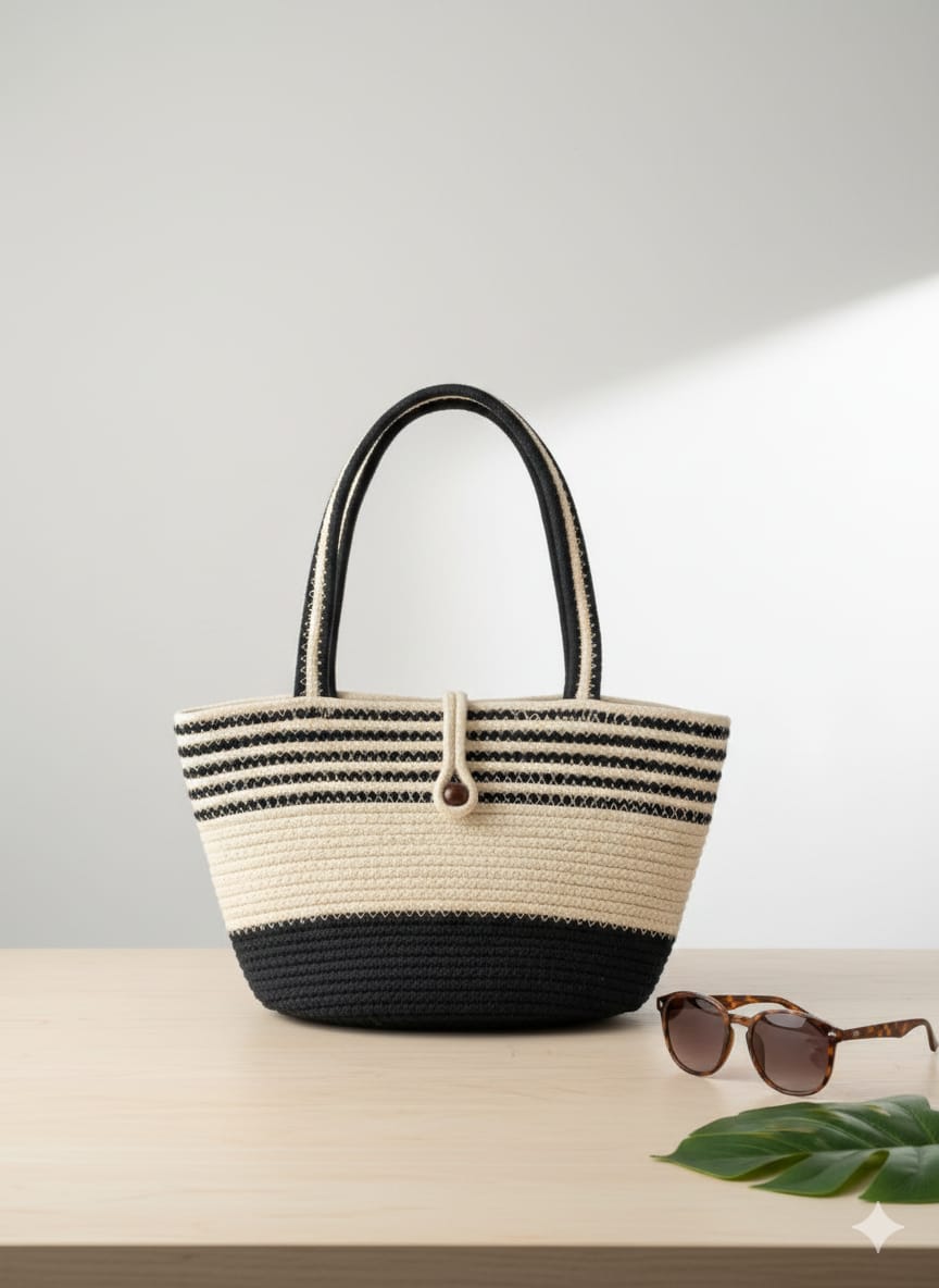 The Midnight Stripe Handmade Jute Tote is designed for those who love minimal elegance with a strong character. Featuring a deep black base with subtle natural jute stripes, this tote offers ample space and a refined silhouette.